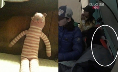 공개된 사진은 김하늘이 KBS 2TV '해피 선데이-1박2일' 여배우 특집에 출연했을 당시의 모습으로, 그는 야외 취침 때 줄무늬 인형을 갖고 온 것을 알 수 있다.