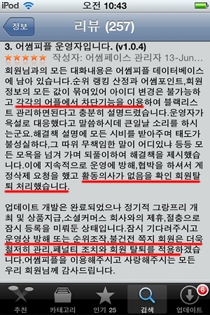 게시판에는 '사용 의사가 없는 경우 계정을 삭제할 수 있으며, 불쾌한 내용의 쪽지를 보내는 회원은 해당 앱의 차단기능을 이용하면 된다'는 내용과 함께 '향후 불건전한 회원에 대해서는 불이익을 주거나 회원 탈퇴시키는 등 철저히 관리할 것'이라고 공지되어 있었다.