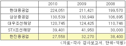15일 조선업계 감사보고서에 따르면 최근 3년간 매출이 한진중공업만 뒷걸음질치고 있다.