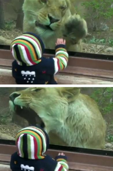 이 동영상은 미국 콜로라도 샤이엔 마운틴 동물원에서 촬영된 것으로 90kg의 암사자가 1살 된 아기에게 관심을 보여 네티즌들에게 화제가 됐다. (사진=유투브 영상 캡처)