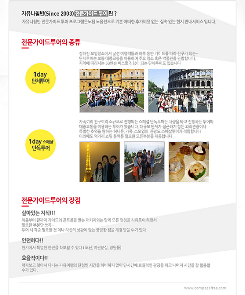 자유나침반은(http://www.compassfree.com/) 은 '가이드가 있는 자유여행'이라는 슬로건을 내세워 전세계 자유여행에 가이드서비스를 포함한 상품을 출시하고 있다.