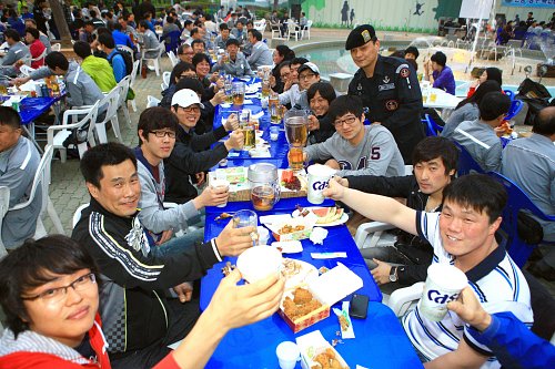 올해로 9년째 이어져 온 불우이웃 돕기 일일호프에 참가한 현대중공업 임직원들과 가족들이 맥주를 마시고 있다.(사진=연합뉴스)