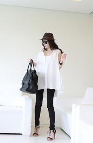 사실 패션에서 가장 베이직하면서도 패셔너블할 수 있는 칼라매치는 블랙 엔 화이트이다. 이것은 여자가 임신을 했다고 해도 바뀌지 않는 공식이다. 보통 임신을 하면 나온 배를 가리기에 급급하여 어두운 톤의 옷을 선택하는데, 오히려 화사한 블랙엔 화이트 컬러 선택이 자연스럽게 라인을 살려줄 수 있다.