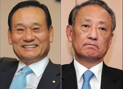 <이팔성 우리금융지주 회장(왼쪽)과 김승유 하나금융지주 회장.>