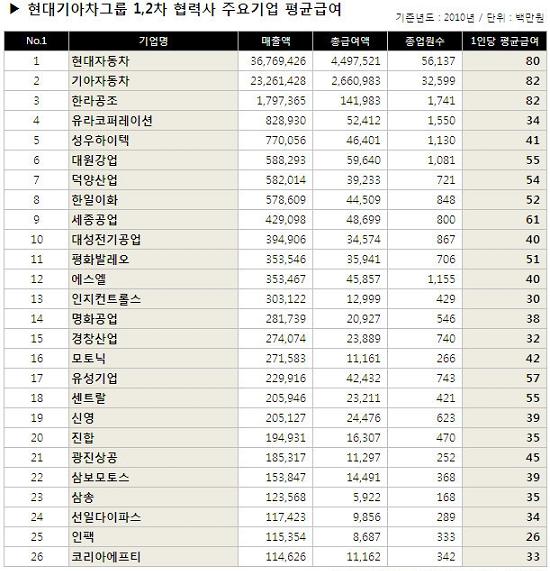 현대차와 기아차의 급여는 8천만원과 8천200만원이었다. 협력업체 직원들의 연봉이 모기업인 현대기아차의 절반 수준에 불과한 것.