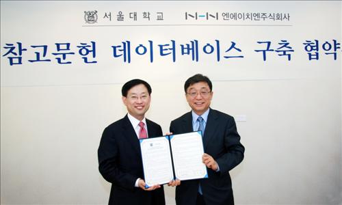 NHN 김상헌 대표(왼쪽)와 서울대 오연천 총장이 참고문헌 공동 DB 구축 등을 위한 업무 협약을 체결하고 있다.