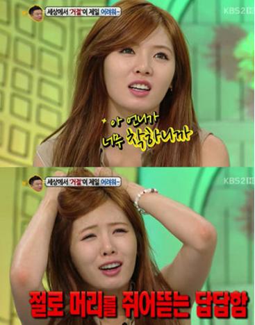 현아는 20일 방송된 KBS '대국민 토크쇼 안녕하세요'에서 시청자의 고민들 들어주던 중 짜증을 내며 답답한 심정을 표현했다.