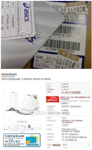 "7만5천원에서 5만1천원으로 할인 판매한다던 운동화가 알고보니 '세일용' 판매가격 스티커 덕지덕지 덧붙여진 3만4천원짜리 떨이상품이었네요."