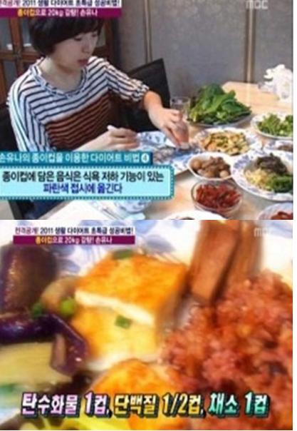 종이컵 다이어트 법은 세끼를 다 먹되 종이컵으로 음식을 계량해서 먹는다. 또 음식을 계량해 파란 접시에 옮겨 담아 먹으면 식욕 저하 기능이 있다고 전했다.