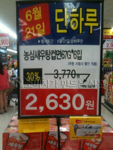 29일 대구 달성군에 사는 김 모(여.32세)씨는 최근 이마트에서 ‘단하루, 농심 새우탕컵면 6개입짜리 2천630원'라고 크게 홍보 중인 제품을 구입했다가 기분만 상했다고 털어놓았다.
