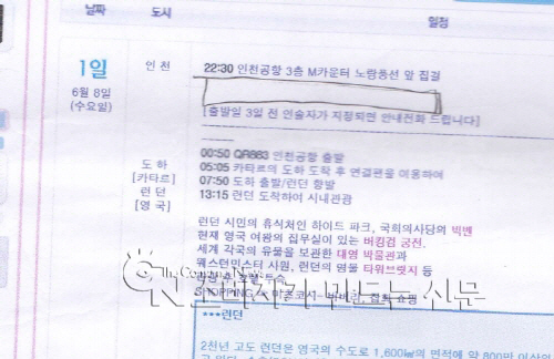 실제 여행상품의 비행기 출발 시간은 6월 8일 00시 50분이었고 집합일은 2시간 전인 6월 7일 22시 30분이었다. 하지만 인터넷에서 출력한 일정표 상에 기재된 집합시간은 6월 8일 옆에 떡하니 22시 30분으로 적혀 있어 혼돈하게 된 것.