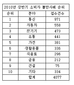 이어 유통이 874건으로 4위를 차지했고 자동차(751건) 생활용품(686건) 가전(664건) 금융(401건) 등의 순으로 집계됐다.