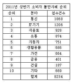 지난해 상반기 자동차 관련 피해제보가 폭증했던 것에 반해 올 상반기에는 삼성전자, 애플, LG전자, 모토로라, 팬택, KT테크 등 스마트폰 관련 불만이 3배 가량 증가했다.