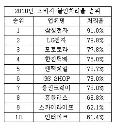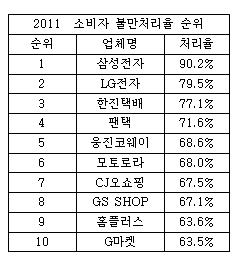 2011년 상반기 소비자불만처리율에서는 삼성전자(90.2%)와 LG전자(79.5%)가 지난해에 이어 나란히 1,2위 자리를 지켰다.