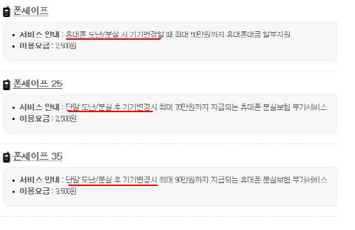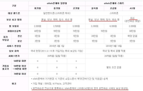 SK텔레콤 보험서비스(월 2천원~ 4천원)가 분실, 도난 시에만 보상금이 보장되는 반면에 KT는 분실, 도난 외에도 화재, 침수, 파손 등에(월 2천원~ 4천원) 최대보상금 70만원을 보상해준다.