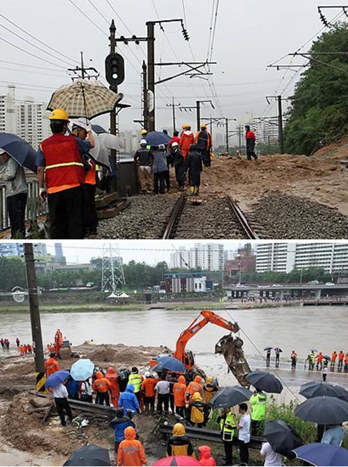 산사태로 인해 경원선 월계~녹천 구간 선로가 유실되면서 전철 1호선 의정부 방면 운행이 전면 중단됐다.