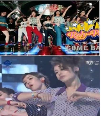 이날 무대에서 티아라는 땡땡이 무늬 의상 등 촌스러운 듯한 복고 의상으로 음악팬들의 시선을 끌었다.