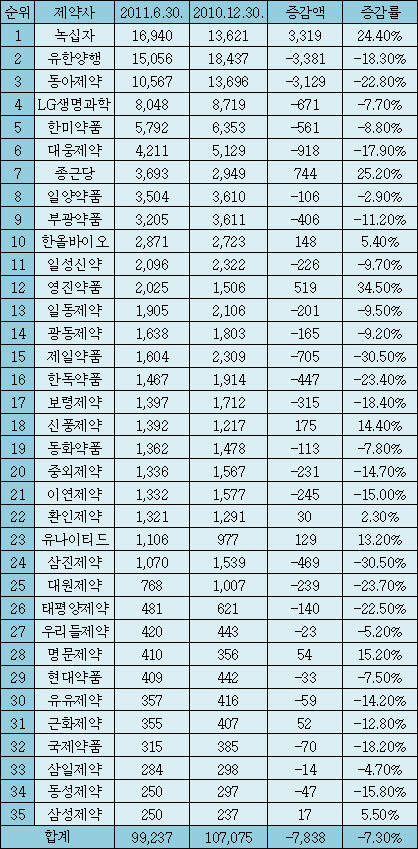 (단위:억원, 순서:시가총액 순)4일 ‘소비자가 만드는 신문’이 국내 코스피 상장 제약사 35개사의 상반기 말(6월30일 기준)시가 총액을 조사한 결과 총 9조9천237억원으로 작년말에 비해 큰 폭으로 떨어졌다.