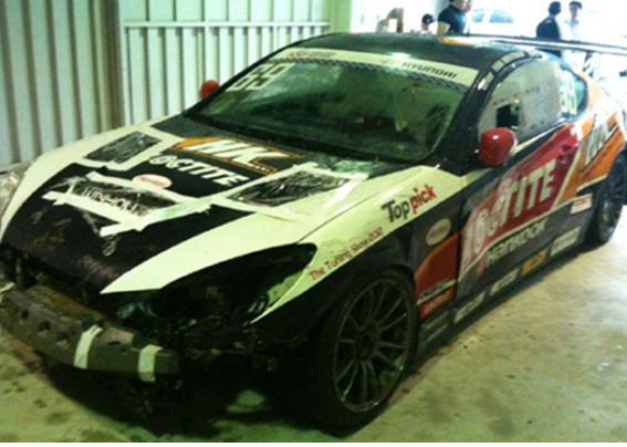 사진 속 카레이싱 차량은 한민관이 '2011코리아 스피드 페스티벌(KSF)'에 출전하며 탔던 차량으로 차체가 심하게 부서져 큰 사고를 짐작케 했다.