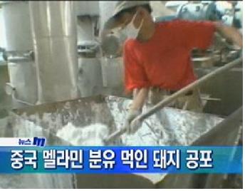 4일 중국 언론에 따르면 중국 충칭과 청두 일대 5곳의 양돈 농가가 멜라민이 기준치보다 최고 5백 배 많이 들어간 분유를 돼지 사료로 사용했다고 보도했다.