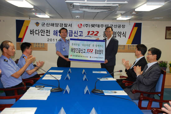 5일 군산해경은 각종 해양사고에대한 신속한 대응을 목적으로 개통한 해양긴급신고 122의 대국민 인지도 확산을 통해 여름철 바다 안전사고를 줄이고자 롯데주류 군산공장(공장장 강춘식)과 홍보 협약식을 체결했다고 밝혔다.