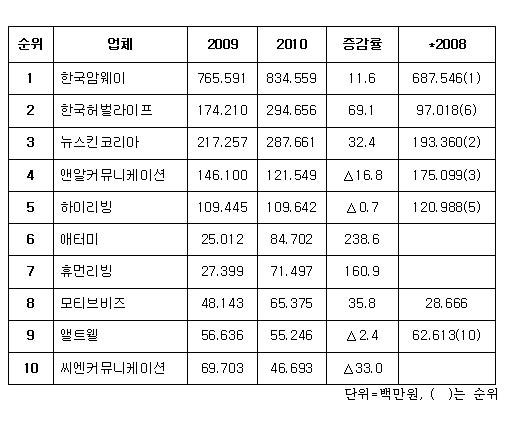 한국허벌라이프는 2009년 1천742억원에서 작년 2천946억원으로 매출을 70% 가량 늘리며 수년간 2위 자리를 지켜온 뉴스킨코리아를 제치고 처음 2위에 올랐다.
