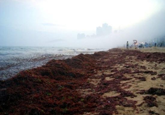 해운대에 해변에 미역 쓰나미가 몰아 친 사진이 화제다.
