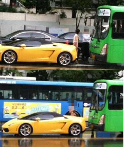 공개된 사진 속에는 노란색 람보르기니와 버스가 멈춰서 있고 람보르기니 운전자로 추정되는 한 여성과 버스 기사가 대화를 나누고 있는 모습이다.