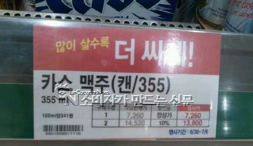 7일 경기 용인시 수지구 풍덕천동에 사는 김 모(남.37세)씨는 최근 롯데마트 주류 진열대에서 카스맥주 캔 6개가 포장된 팩을 2개 구매 시 정상가 1만4천520원에서 10%가 할인된다고 적힌 것을 보고 덥석 장바구니에 담았다가 곤란한 상황을 겪었다고 불평했다.