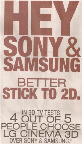 LG전자는 미국 소비자들을 상대로 필름패턴 편광안경(FPR) 방식인 시네마 3D TV와 삼성전자 및 소니의 셔터안경(SG) 방식 3D TV를 비교 실험한 결과를 근거로 최근 USA투데이와 월스트리트저널에 "삼성과 소니는 2D나 만들라"는 내용의 광고를 실었다.