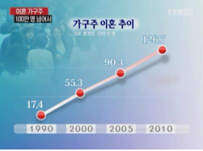 통계청의 2010 인구총조사 결과에 따르면 지난해 11월 기준 이혼 가구주는 126만 7천명으로 100만 명을 돌파했다.