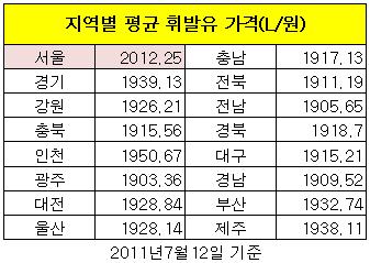 13일 한국석유공사의 유가정보사이트 오피넷(www.opinet.co.kr)에 따르면 12일 오후 4시를 기준으로 전국 주유소 휘발유 평균가격은 전날보다 ℓ당 3.83원 오른 1천927.03원을 기록했다. 그러나 서울 지역은 2천12.25원을 기록해 소비자들의 심리적 마지노선인 2천원을 껑충 뛰어넘었다.