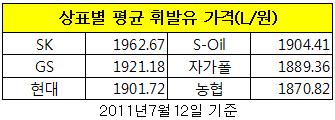 실제로 SK는 이날 평균 휘발유 가격이 1천962.67원으로 가장 비쌌다. 그 뒤를 이어 GS(1천921.18원), S-Oil(1천904.41원), 현대(1천901.72원), 자가폴(1천889.36원), 농협(1천870.82원) 순으로 나타났다.
