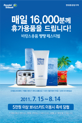 이번 행사는 전국 현대오일뱅크 계열 주유소 및 충전소를 이용하는 5만원 이상 보너스 카드 고객을 대상으로 실시된다. 매일 1만 6천여명을 추첨해 선크림, 여행용 세면도구 셋트, 스포츠 타올, 라면 등 바캉스 용품을 증정한다.