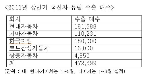 올해 상반기 우리나라에서 유럽으로 수출된 자동차는 총 47만2천669대(현대·기아차는 1~5월 집계)이며, 같은 기간 유럽차 수입업체의 국내 총 판매 대수는 3만4천970대이다.