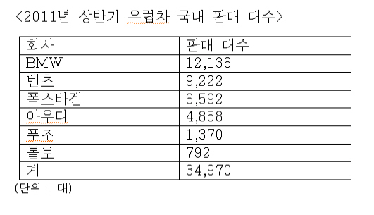 외산차 중 국내서 가장 높은 시장점유율(23.49%)을 자랑하는 BMW코리아는 올해 상반기 판매 1만2천136대로 전년동기(6901대)보다 2배 가까이 증가했다. 같은 기간 메르세데스-벤츠코리아는 9천222대, 폭스바겐코리아는 6천592대, 아우디코리아는 4천858대를 판매했다.