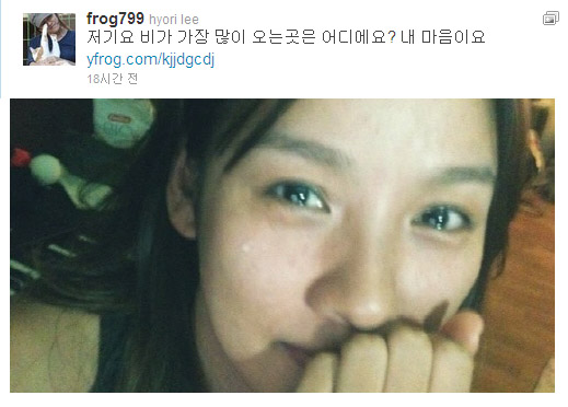 이효리는 14일 자신의 트위터에 “저기요. 비가 가장 많이 오는 곳은 어디에요? 내 마음이요”라는 글과 함께 사진을 게재했다.
