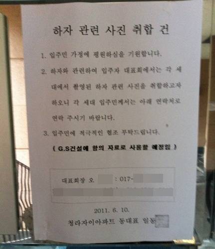 입주자 입장에서는 아파트 하자가 집값 하락으로 이어질까 걱정돼 조용한 해결을 원하는 경우가 대부분임을 감안할때 이처럼 벽보까지 붙여 항의 움직임을 보이기는 쉽지 않다.