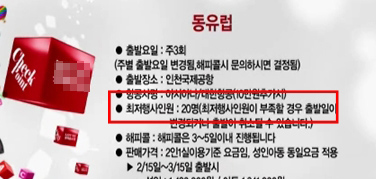 한편 여행업자는 약관에 따라 최저행사인원 미 충족 시 계약을 해제할 수 있지만 기일 내 통지를 하지 않는 경우, 이미 지급받은 계약금 환급 외에도 여행요금의 20%(여행출발 1일전까지 통지 시), 여행요금의 50%(여행 당일 통지 시)를 배상해야한다.