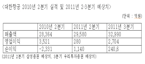 대한항공의 올해 2분기 실적은 ▲일본 대지진으로 인한 생산차질 ▲유가 상승 ▲사업비 상승 등으로 인해 썩 좋지 못한 것으로 알려져 있다. 삼성증권에 따르면, 대한항공 2분기 매출액은 2조9천580억원으로 1분기보다 증가했지만, 영업이익(280억원)과 당기순이익(1천140억원)은 크게 감소해 효율성이 저하된 것으로 파악됐다.
