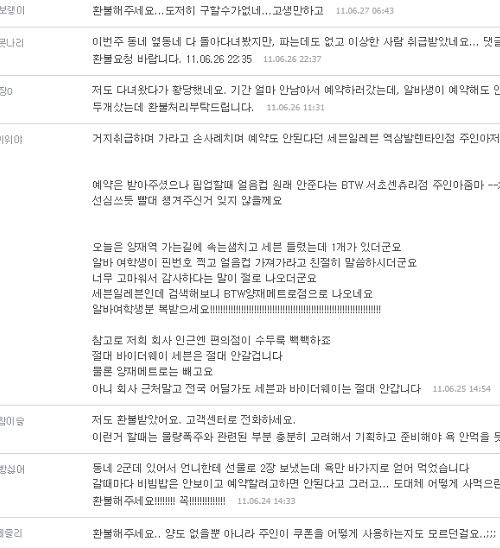 정 씨는 “설사 커뮤니케이션의 오해라고 하더라도 서비스업체에서 고객에게 따지듯이 응대해 고객에게 불쾌감을 주는 것은 무슨 경우냐”며 “그리고 업체에서 월요일로 알고 있었다면 적어도 당일 왜 안 오냐는 확인전화라도 했어야 하는 게 아니냐”며 분통을 터트렸다.