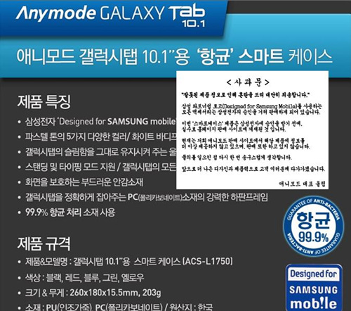 앞서 애니모드는 갤럭시탭 10.1의 케이스를 내놓고 삼성전자 공식 인증을 받은 제품이라고 홍보했었다.