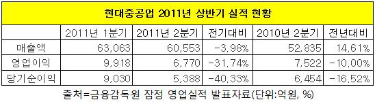 김홍균 동부증권 애널리스트는 "당초 현대중공업의 올 2분기 영업이익률을 11.8%로 예상했는데, 이번에 발표된 자료에 따르면 불과 11.2%에 그쳤다"며 "전기전자, 그린에너지, 플랜트 부문도 2분기에 실적이 빠졌다"고 말했다.