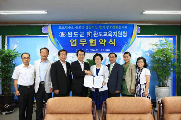 군은(군수 김종식) 지난 20일 전라남도완도교육지원청(교육장 장진숙 )과 MOU를 체결하고, 도로명주소의 조기정착을 위해 상호 협력키로 했다고 21일 밝혔다.