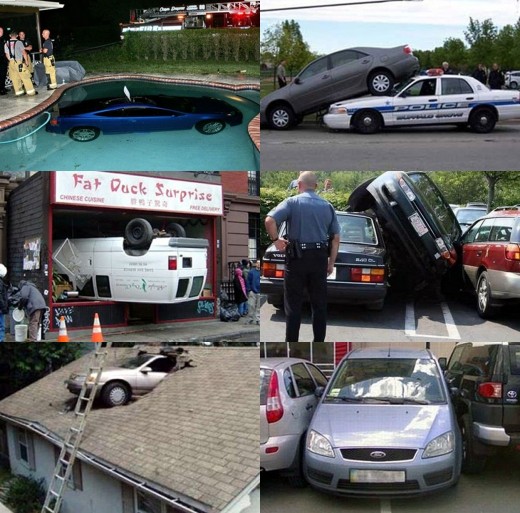 경찰차 앞 범퍼에 올라선 승용차, 1m도 채 되지 않는 좁은 틈 사이에 주차한 차량, 수영장 속에 있는 스포츠카, 식당을 뚫고 뒤집힌 채 들어가 있는 승합차, 지붕을 뚫고 나온 차량 등 엽기적인 모습으로 웃음을 자아냈다.