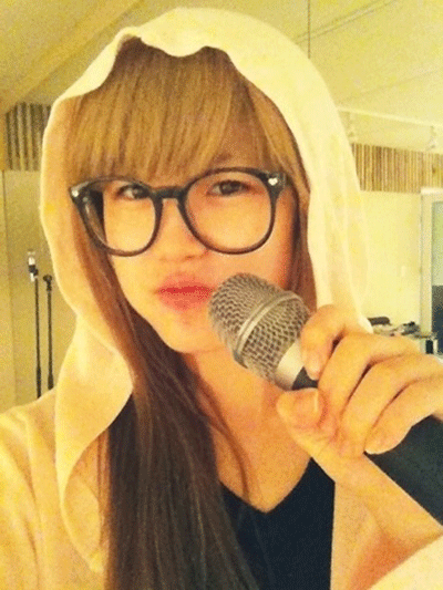 사진 속 전효성은 흰 색 후드 티 모자를 쓰고 검은 뿔테 안경을 낀 채 마이크를 잡고 있다. 안경 밖으로 투명한 피부와 도톰한 입술이 빛나 눈길을 끌고있고 눈썹은 앞머리에 가려 보이지 않는다.