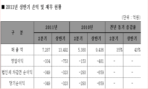그러나 영업이익(-753억원)과 당기순이익(-323억원)은 여전히 적자를 면치 못했다. 특히 영업이익 분야에서는 전년동기(-481억원)보다 272억원이나 손실이 확대돼 심각성을 더했다.