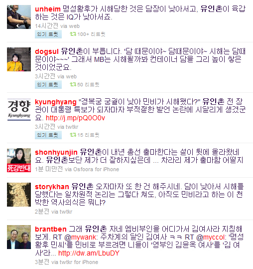 특히 트위터에서는 유 전 장관의 언행에 대한 강도높은 비난이 이어지고 있다. (사진-트위터 검색어 '유인촌' 실시간 검색결과)