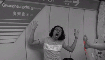 공개된 사진은 광흥창 역에서 김경진이 누군가의 발을 보고 과하게(?) 놀라는 모습이 담겨있다. 최근 화제가 되고 있는 '옥수수 귀신'을 패러디한 것.