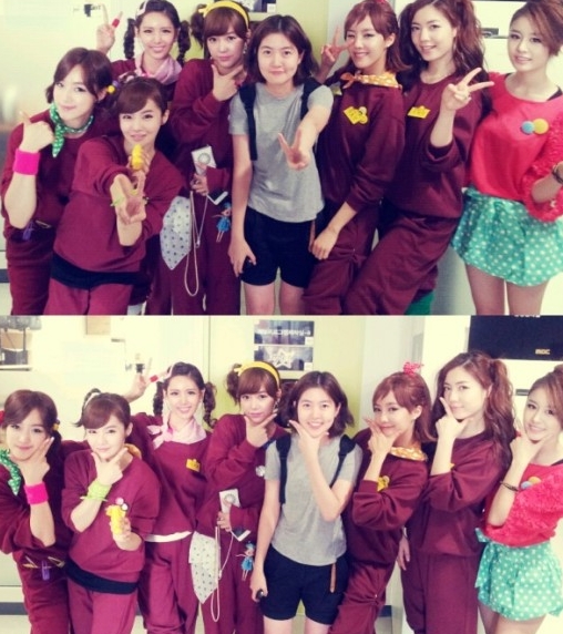 이날 심은경은 MBC TV ‘쇼 음악중심’의 티아라 대기실을 방문했다. 사진 속 티아라는 붉은색 체육복을 입고 있고 심은경은 수수한 차림을 하고 있다.